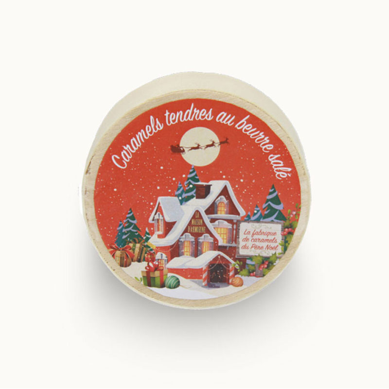 Dans sa petite boite en bois, notre caramel tendre au beurre salé a revêtu les couleurs de Noël !